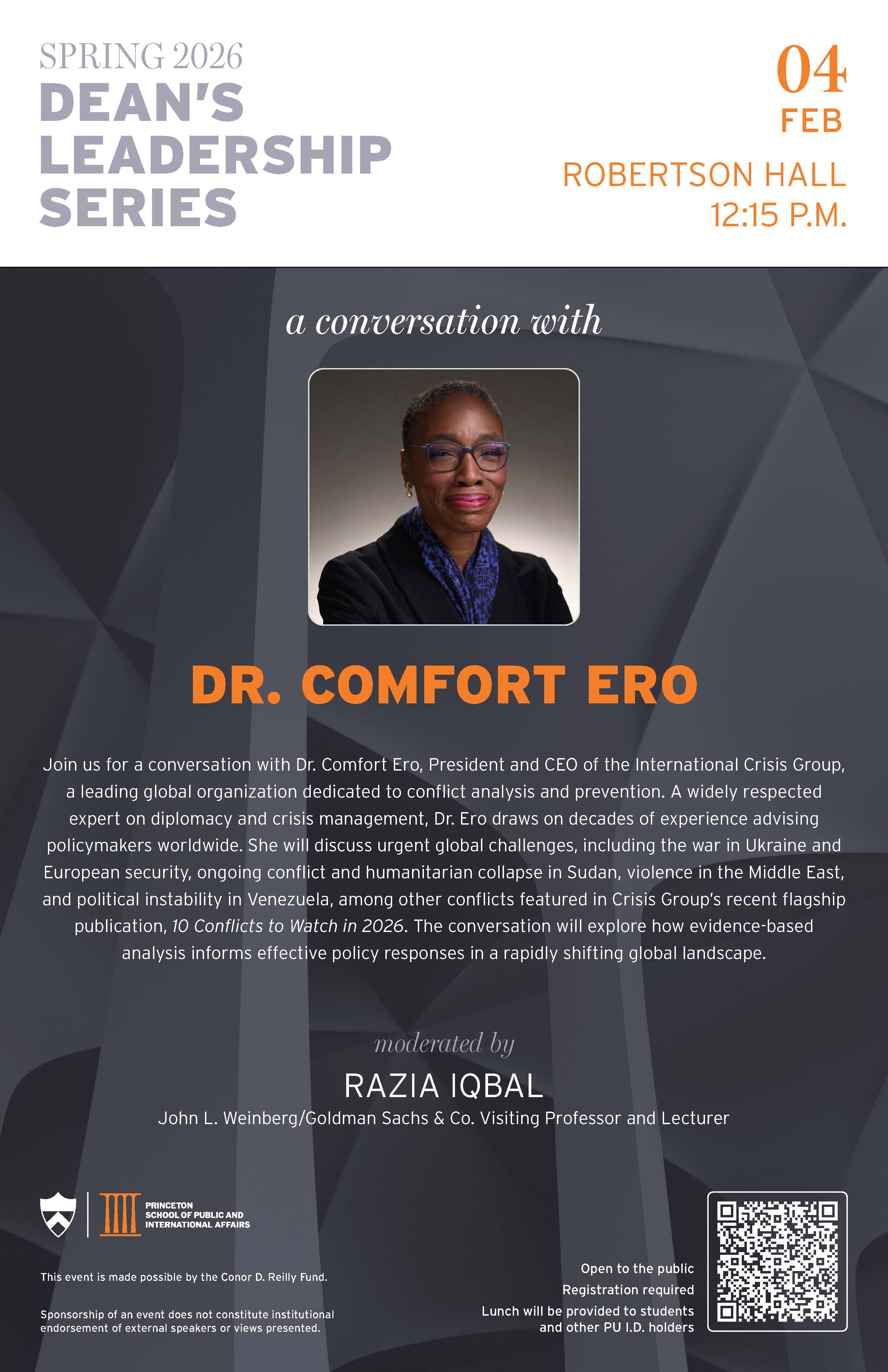 Join us for a conversation with Dr. Comfort Ero, President and CEO of the International Crisis Group, a leading global organization dedicated to conflict analysis and prevention. A widely respected expert on diplomacy and crisis management, Dr. Ero draws on decades of experience advising policymakers worldwide. She will discuss urgent global challenges, including the war in Ukraine and European security, ongoing conflict and humanitarian collapse in Sudan, violence in the Middle East, and political instability in Venezuela, among other conflicts featured in Crisis Group's recent flagship publication, 10 Conflicts to Watch in 2026. The conversation will explore how evidence-based analysis informs effective policy responses in a rapidly shifting global landscape.