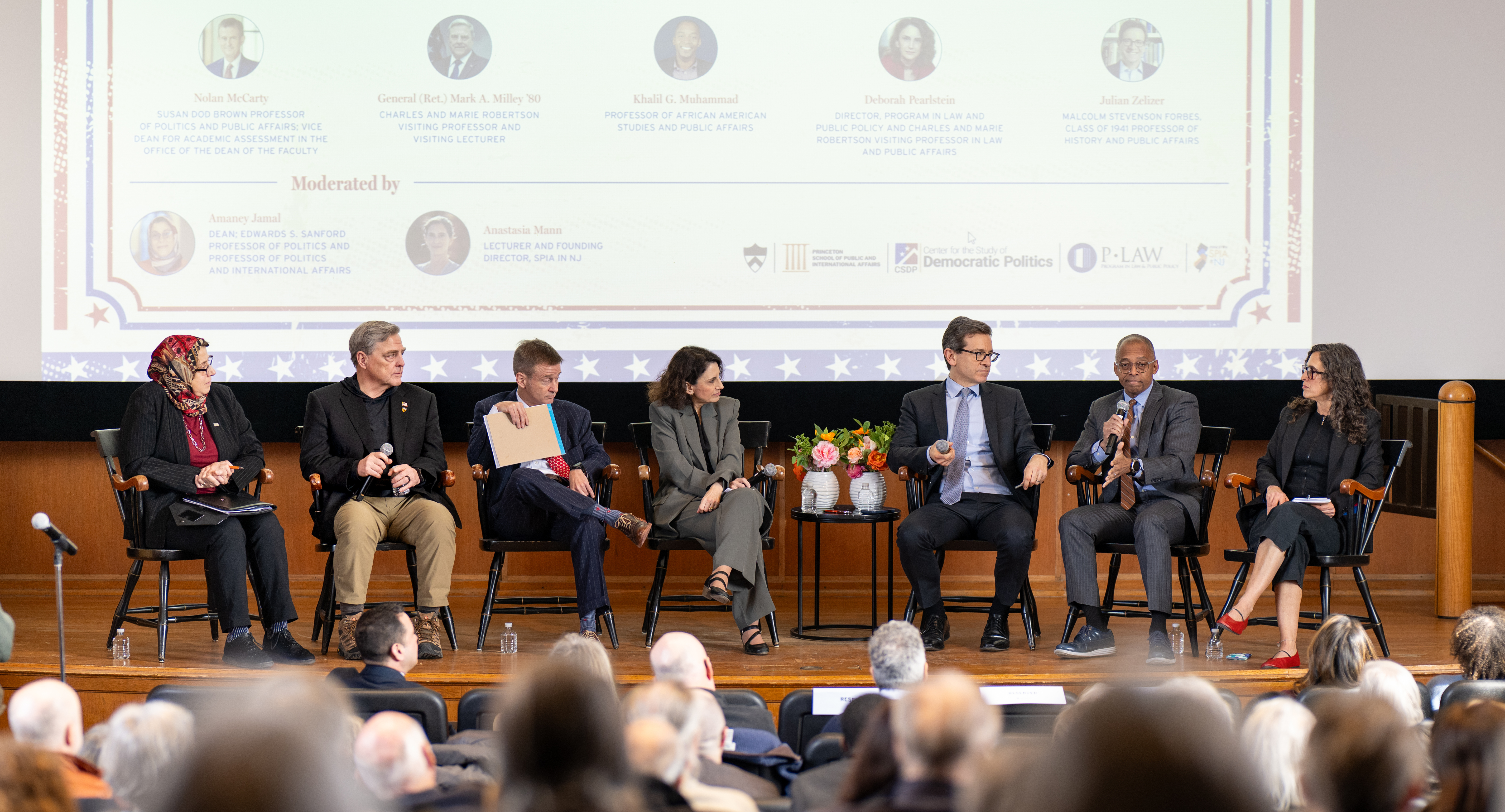 Panelists included Nolan McCarty, the Susan Dod Brown Professor of Politics and Public Affairs and vice dean for academic assessment in the Office of the Dean of the Faculty; Khalil G. Muhammad, a professor of African American studies and public affairs; Deborah Pearlstein, director of the Program in Law and Public Policy and Charles and Marie Robertson Visiting Professor in Law and Public Affairs; Julian Zelizer, the Malcolm Stevenson Forbes, Class of 1941 Professor of History and Public Affairs; and Retired U.S. General Mark Milley, Charles and Marie Robertson Visiting Professor and visiting lecturer. The conversation was co-moderated by Princeton SPIA Dean Amaney Jamal and Anastasia Mann, the founding director of SPIA in NJ.